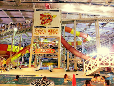 The pool, although there is an indoor and outdoor pool, is only available during the summer season. And even though it's called a pool, it's really not. It's more like a lazy river with a landing zone in the middle for people coming down the water slides. To be honest, I couldn't actually imagine paying the 2700 yen just for the "pool," which is why I went during their summer sale which had a 1000 yen entrance fee (plus 1300 yen for afterhours use), but this also included a wristband to ride all the slides as many times as you want.